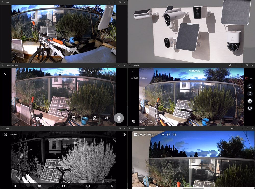 המצלמות המשתתפות במבחן הן: Eufy Anker S330 | Baseus S1 Pro Outdoor | Reolink Argus 3E | Xiaomi Solar Outdoor Camera BW400 Pro Set | Virtavo SolarFlask2K Outdoor