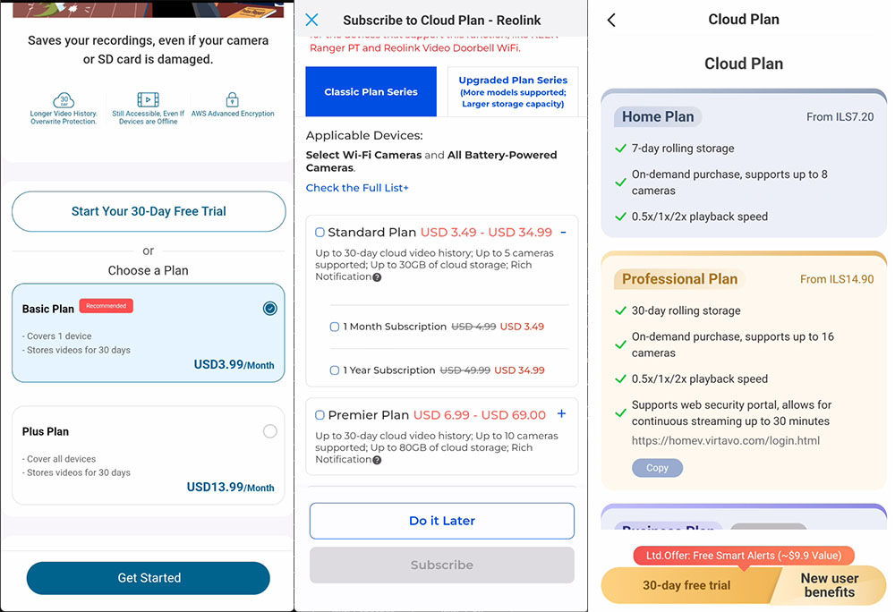 בייסוס כלל לא מציעה שירות אחסון בענן שזה לטוב ולרע, אך יכולת הזיהוי האוטומטית זמינה ברציפות. המצלמה עם התוכנית הכי סבירה היא Reolink דרכה מוצעת תוכנית אחסון ל-30 יום ב-3 דולר לחודש או 33 דולר לשנה. הזיהוי המתקדם אינו דורש את תוכנית הענן אך אם תרצו התראה הכוללת וידאו ולא רק תמונה, תדרשו להירשם לתוכנית.