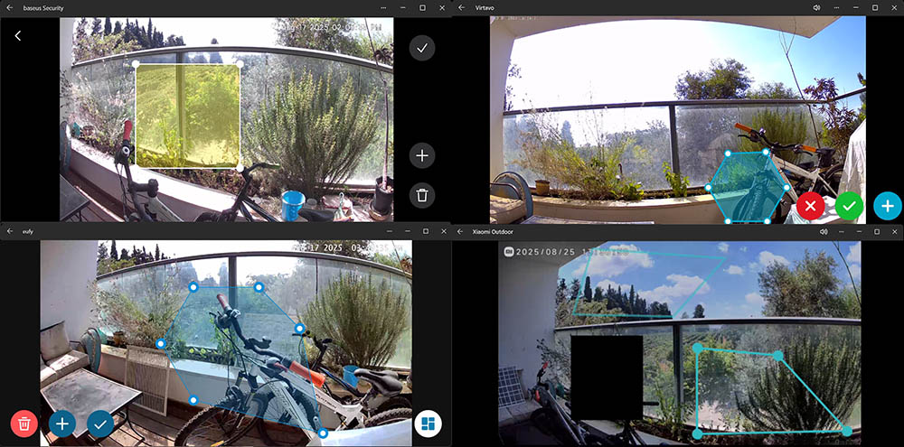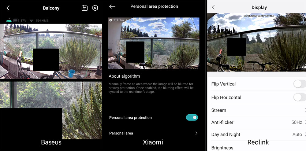 בריאולינק, בייסוס ושיאומי אפשר בנוסף להגדיר אזור פרטיות המציג ריבוע שחור על חלק מהתמונה והוא מופיע בשידור החי ובהקלטה. בולטת לטובה היא הריאולינק שבה אפשר להגדיר גודל מינימלי ומקסימלי של אדם, רכב או בעל חיים כך שרק בין הפרמטרים האלה, המצלמה תקליט ותתריע. כמו כן, זו המצלמה היחידה שמאפשרת לראות תצוגה חיה היכן היא מזהה תנועה. עם המידע הזה, אפשר להגדיר במדויק ממה עליה להתעלם כדי למנוע הקלטות שווא.