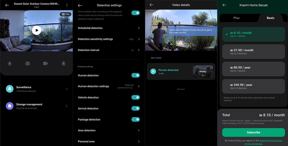 אחת המרגיזות מביניהן הייתה המצלמה של שיאומי שהציעה שנרכוש את השירות שלה בכל פעם שצפינו בהקלטה שאוחסנה מקומית. כך שבכל רגע שסרטון בן 9 שניות נעצר, עולה הודעה להירשם לשירות ה-Xiaomi Home Secure כדי לקבל הקלטת וידאו מלאה. תחילה חשבנו שהגדרנו את המצלמה על הקלטה מקסימלית של 10 שניות - הגדרה שקיימת בכל המצלמות כחלק מתוכנית החסכון בסוללה. אך כשראינו שהמצלמה מוגדרת על הקלטה של 30 שניות לקטע ואין אף קטע אחד שעובר את ה-9 שניות - למרות שיש תנועה ברורה של אדם, הבנו שזו הגבלה מלאכותית.