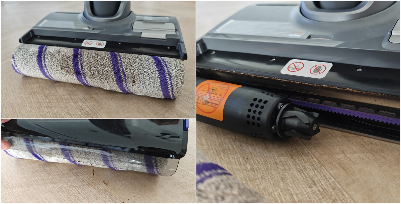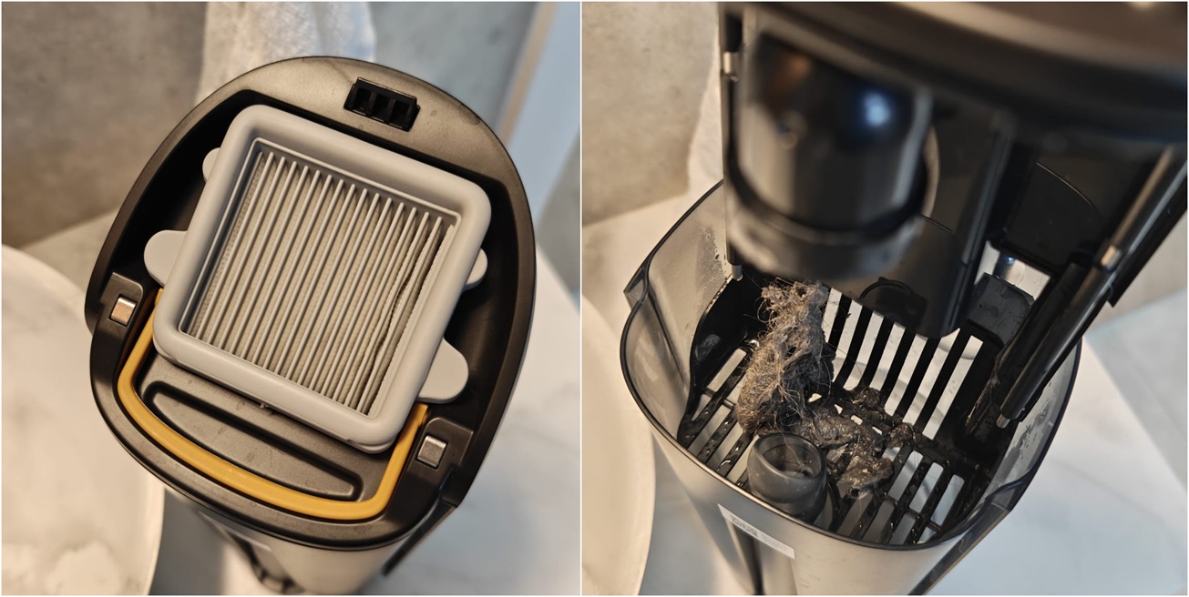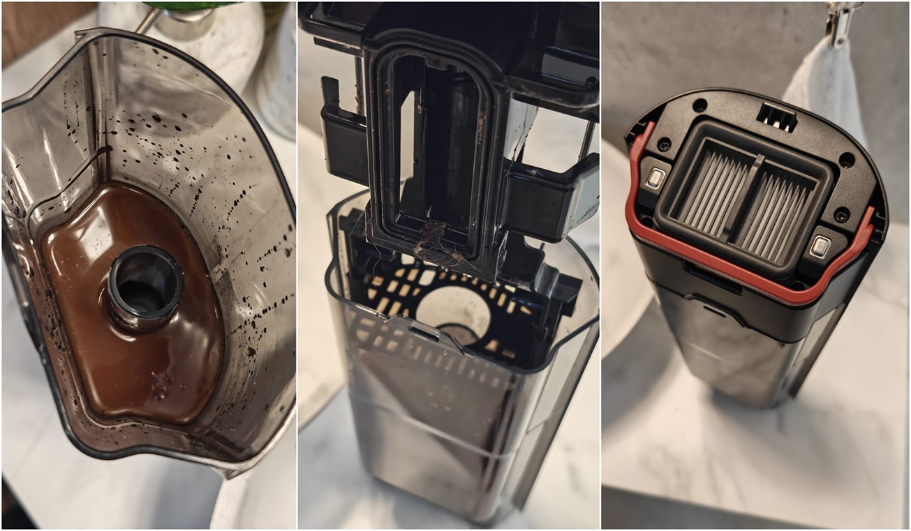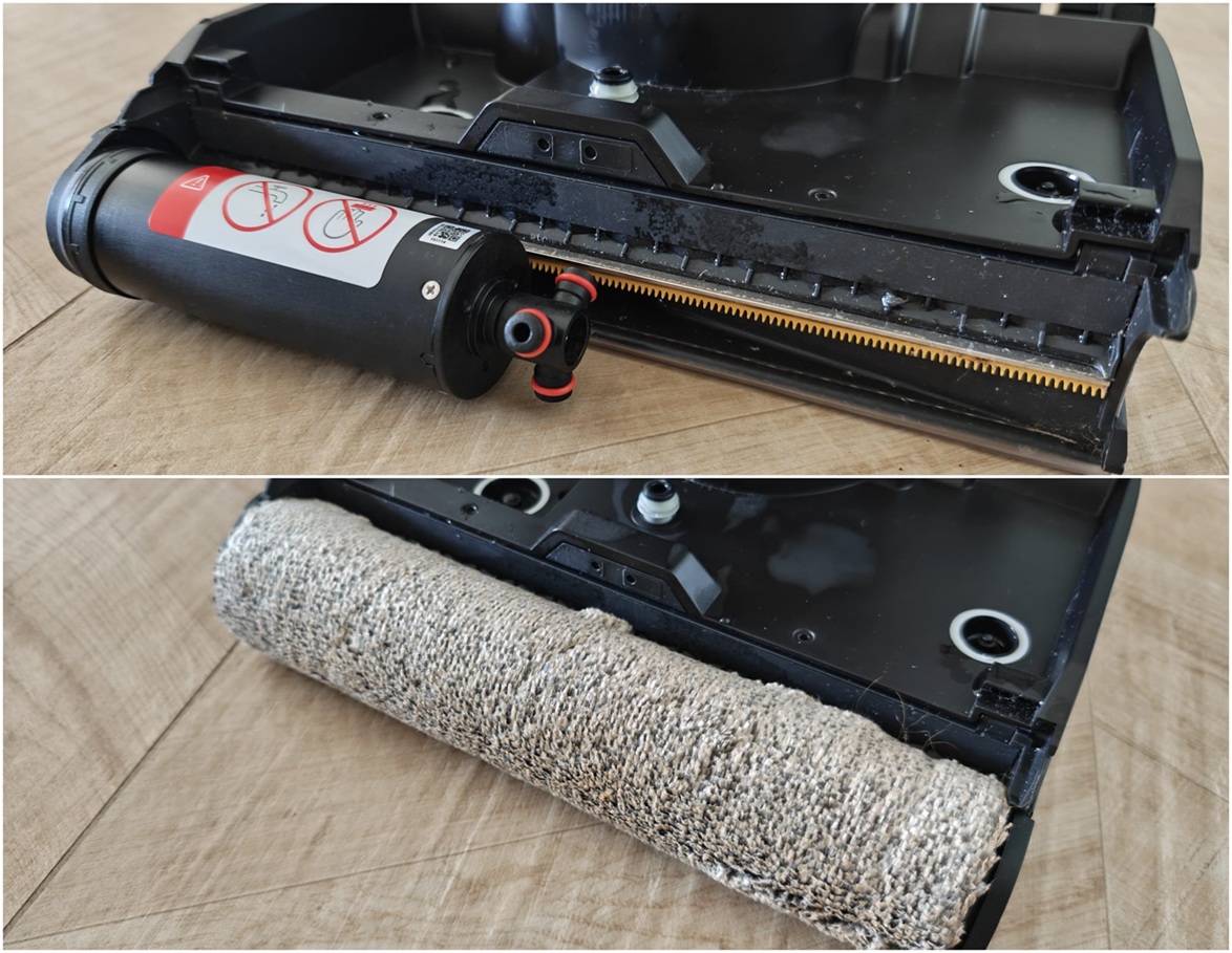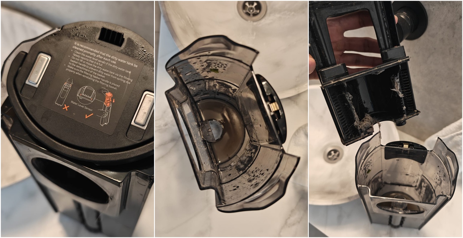 ל-Roborock יש את המיכלים המנופחים ביותר: מיכל המים הנקיים נפחו ליטר ותא האחסון הייעודי לנוזל הניקוי מאפשר להכניס בנוסף עוד 100 מ"ל של תמיסה. נפח מיכל המים המלוכלכים: 720 מ"ל. מיכל המים הנקיים שולב באזור הרולר והוא פשוט לתפעול; הסטת מתג שולפת אותו החוצה קלות. בבסיסו שני פתחים, אחד למילוי מים מהברז והשני עבור מילוי תמיסת הניקוי שקיבלנו במארז. מיכל המים המלוכלכים שולב בקדמת המוט. ברגע ששולפים אותו, נחשפת ידית קטנה שבמשיכתה, נחשפים מסנן הפלסטיק שמאגד את השיער ולכלוך רטוב - ומתחתיו המים העכורים. החלוקה טובה למדי והרוב המוחץ של הלכלוך הקשה נותר למעלה, בזמן שהמים המלוכלכים נותרו למטה, ומשם נשפכו ישר לאסלה.