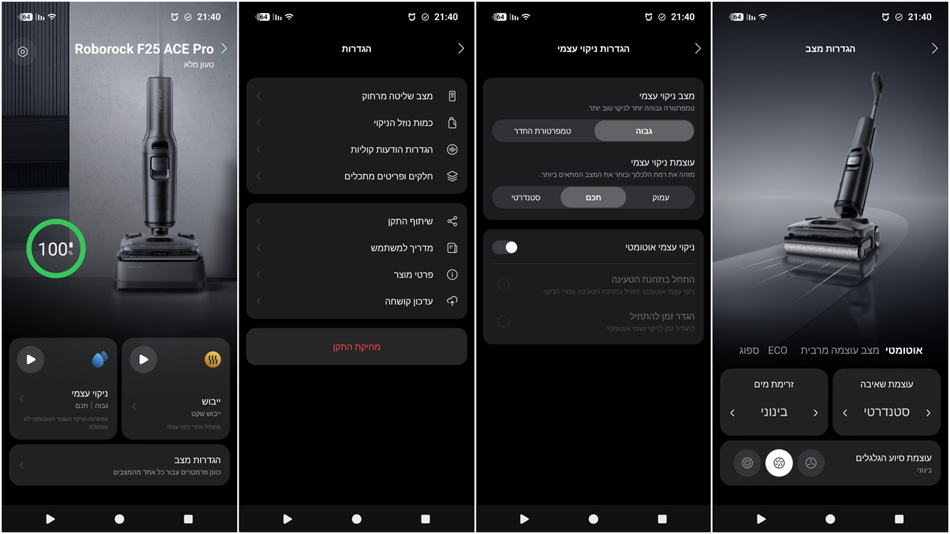 האפליקציה של Roborock מצוינת וזמינה בעברית מלאה. ניתן לקבוע הגדרות ייבוש והגדרות ניקוי עצמי כמו גובה טמפ' ועוצמת ניקוי, קביעת עוצמת סיוע הגלגלים וכן להגדיר את עוצמת השאיבה וזרימת המים של כל מצב בפרד. עוד באפליקציה: שליטה מרחוק כשהמוט אנכי, כמות נוזל הניקוי ומעקב אחרי פריטים מתכלים. חבל רק שאין היסטוריית עבודות.