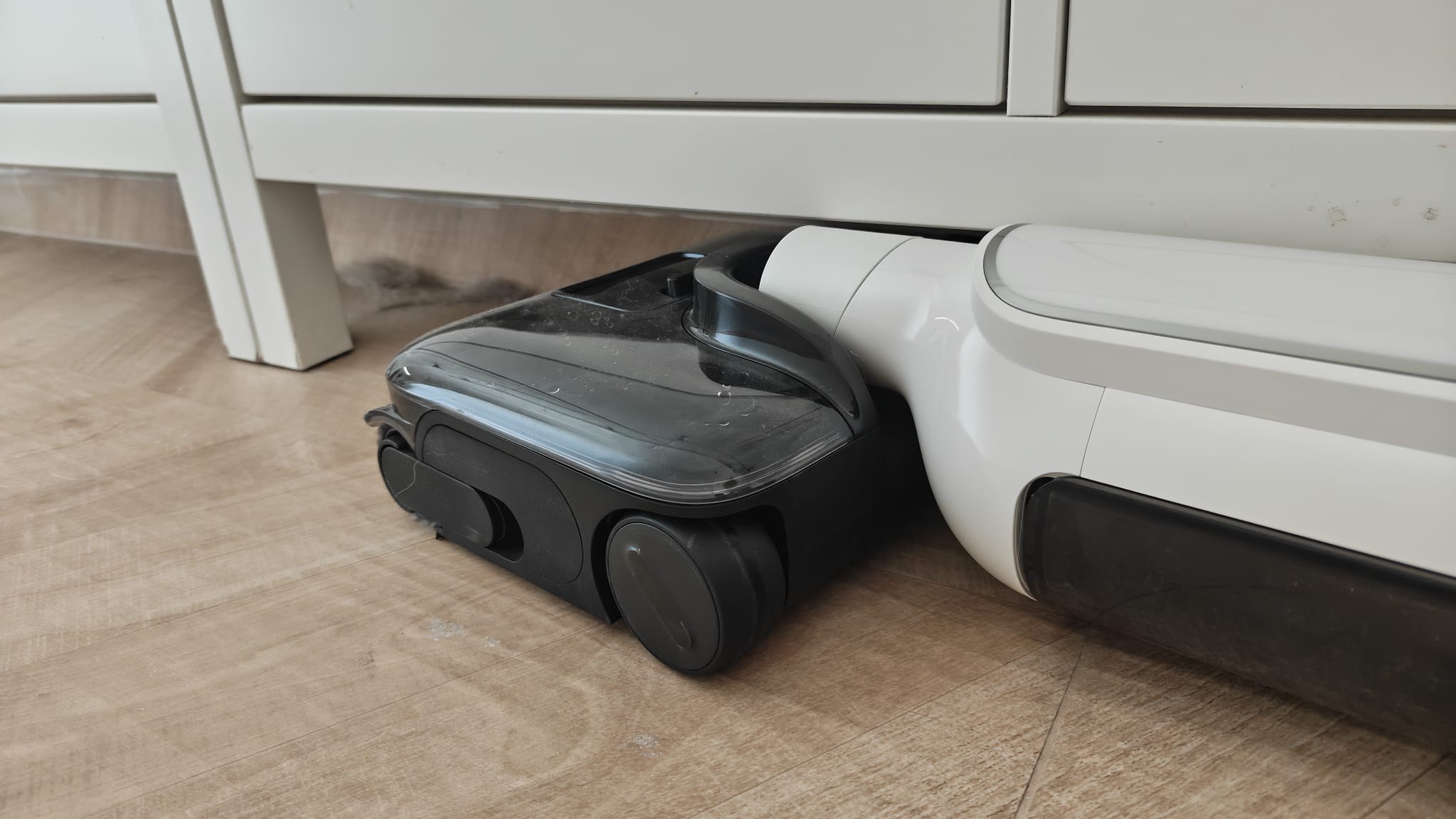 ההתניידות עם Xiaomi טובה אבל לא מושלמת: ראשית, הוא די כבד, כ-5.1 ק"ג ורוב כובד המשקל מצוי בקדמת השואב, באזור תא המים הנקיים. ההרגשה היא שהשואב מוביל קדימה את המשתמש - ובמקרה אחר כנראה שלא היינו מתלוננים, אבל שילוב של גלגלים ממונעים שלא ניתן לשלוט על התאוצה שלהם, לצד גוף די כבד, דורשים יחד התנגדות קלה מצד המשתמש - ואחרי 10-15 דקות של שימוש מרגישים את היד מתעייפת. יש עוד עניין: במהלך התנועה איתו, רטט קבוע מלווה את ידית המוט, שעובר ליד האוחזת ומורגש היטב בזמן העבודה. אותן רעידות יוצרות תחושת חיכוך קלה ובשימוש ממושך פוגעות בתחושת השליטה. התמרון בפניות חדות או סביב רהיטים סביר למדי ולשמחתנו, המוט מאפשר הטיה ב-180 מעלות. רק קחו בחשבון שהוא עצמאי: אם לא תאחזו בו במצב הטיה מלאה, הוא פשוט ימשיך לנסוע עד שמשהו יעצור אותו.