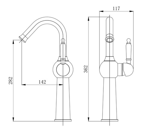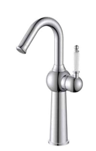 ברז גבוה לכיור מונח בעל פיה מסתובבת וידית חרס לבנה.