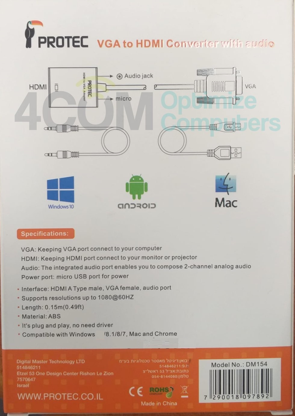 מתאם מ-VGA ל-HDMI כולל אודיו חברת PROTEC