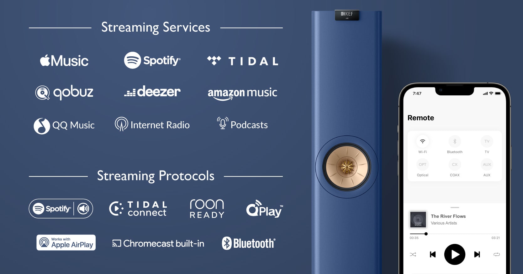 הזרימו הכלLS60 Wireless מספקים לכם תאימות אלחוטית ישירות מהקופסה עם Wi-Fi, Apple AirPlay 2, Google Chromecast ו- Bluetooth. באמצעות אפליקציית KEF Connect תוכלו להזרים מ- Amazon Music, Qobuz ו-Deezer או להאזין לרדיו ולפודקאסטים אינטרנטיים. תוכלו להשתמש באפליקציות מקוריות כדי להזרים ישירות מ-Spotify Connect, Tidal Connect ו-QPlay, והם גם מוכנים ל-Roon*.ה- LS60 Wireless תומכים גם בהזרמה של קבצי PCM עד 24bit/384kHz, כמו גם פענוח DSD ו-MQA, מה שמאפשר לכם להפעיל קבצי אודיו וסטרימים של MQA, המספקים צליל של הקלטת מאסטר מקורית.*צפי לשחרור בסתיו 2022.