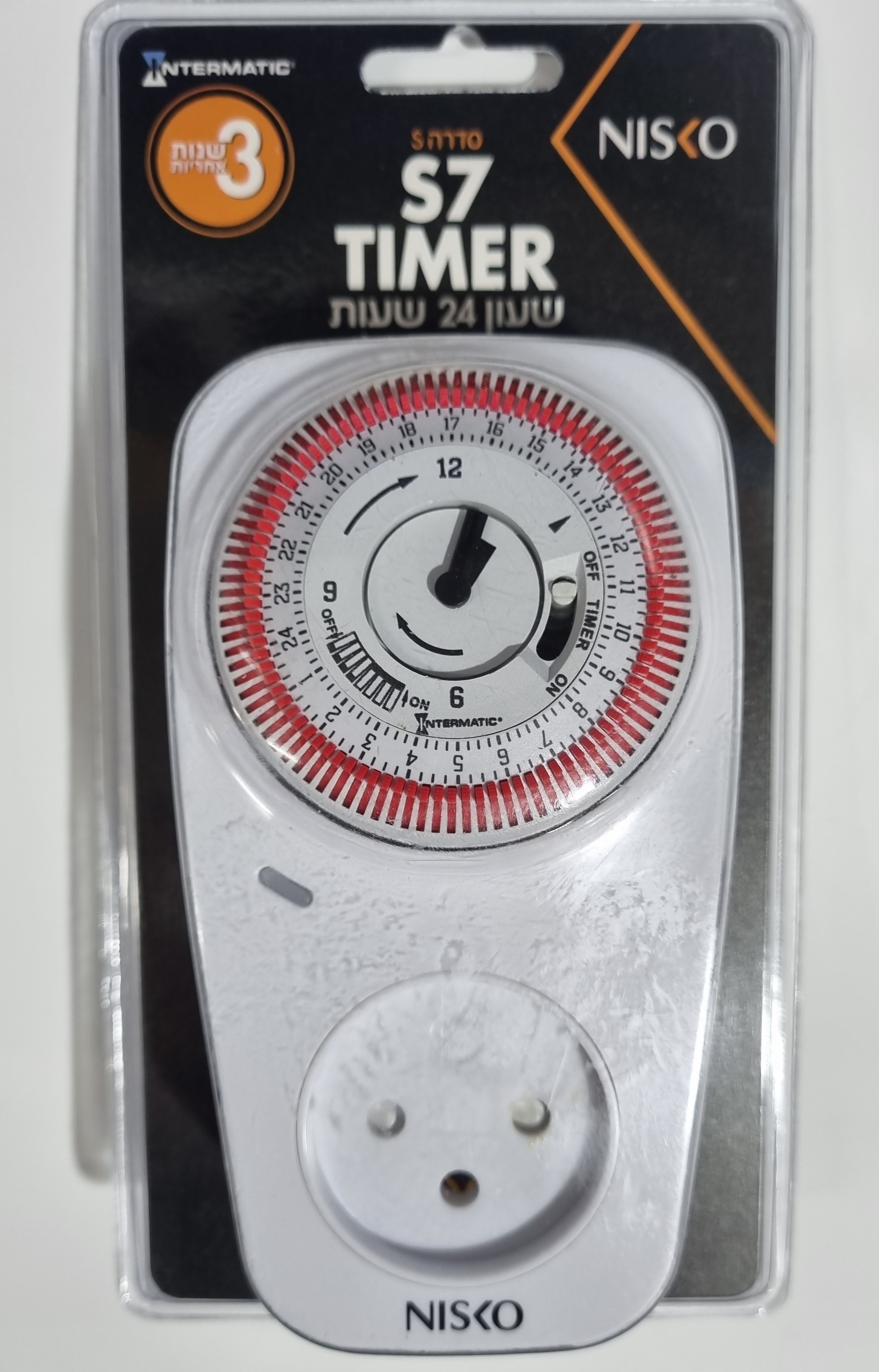 שעון 24 שעות S7 שקע לתקע ישראלי . השעון מאפשר לתזמן ביממה זמני הפעולה והכיבוי של המכשירים אליהם הוא מחובר ברמת דיוק גבוהה מאוד . מנגנון אינטרמטיק. קיימת נורית חיווי למצב הפעלה .נתוני הפעלה: הפעלה קבועה , כיבוי קבוע וטיימר .