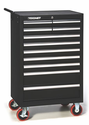 עגלת עבודה בעלת 11 מגירות מבית סיגנט. צבע שחור. בעלת גלגלים עם מייסבים, חזקה ומסיבית תפס לכל מגירה, מתאים למגשי הכלים של SIGNET, משקל נשיאה למגירה 70 קילו. משקל כולל: 80 ק"ג.