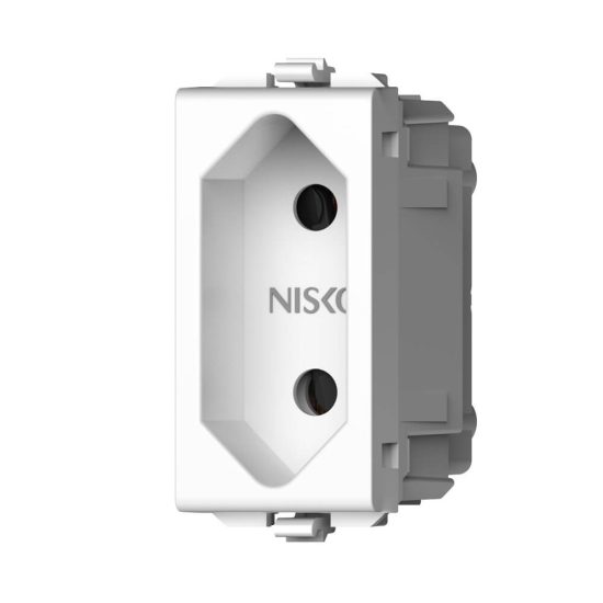שקע כח דו פיני מסדרת הדגל ניסקו סוויץ’ בעל תריס הגנת ילדים – מותאם לדרישות התקן הישראלי. מנגנון ייחודי שמתאים להידוק חוטים בקטרים שונים. שליפה מהחזית – אין צורך לפרק את המתאם מהקיר. מנגנון מכאני ייחודי לקיבוע השקע במתאם המעניק כח התנגדות שליפה.