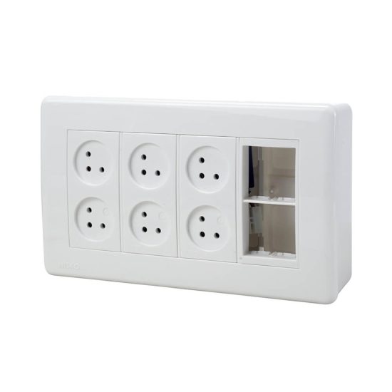 עמדה חשמל ותקשורת דקורטיבית מודולרית על הטיח 8 מודול, 6 שקעים ומתאם גוויס, המארגנת את סבך הכבלים באלגנטיות וביעילות. מיוצרת מפוליקרבונט, חומר כבה מאליו. אידאלית להתקנה לצד שולחנות לימוד בחדרי ילדים, עמדות טלויזיה ומשרדים. ניתן להזמין עמדה הכוללת שקעי כח מוגני ילדים, הנדרשים בבתי ספר ובגני ילדים, בהתאם לנהלי בטיחות משרד החינוך ובמוסדות ציבוריים אחרים.