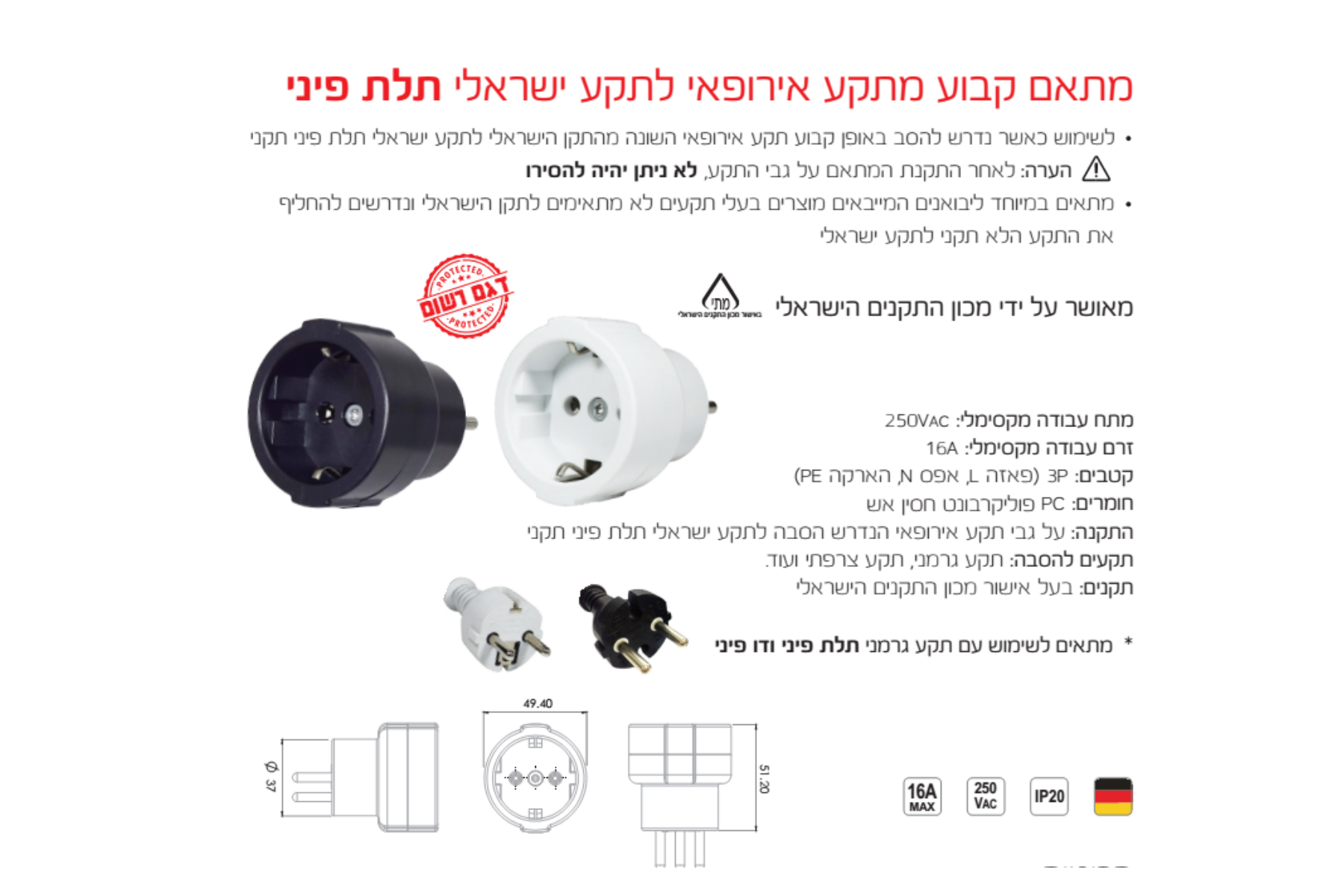 מתאם חשמל המאפשר לחבר תקע חשמל אירופאי (גרמני) לשקע ישראלי תקני כולל הארקה. מתאים לתקעים עם 2 או 3 פינים.