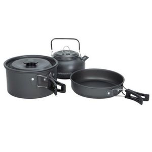 ערכת סירי בישול קומפקטית (3 חלקים) – כוללת סיר, מחבת וקומקום עם ידיות מתקפלות לאחסון ונשיאה נוחים.
