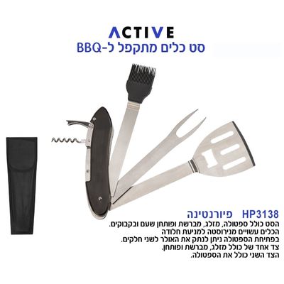 סט כלים מתקפל לברביקיו כולל את כל האביזרים הנחוצים לצלייה ובישול בשטח, ארוזים בצורה קומפקטית ונוחה.