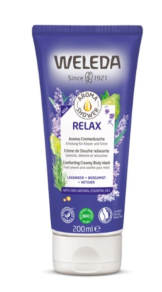 סדרת Aroma Shower של WELEDA מפנקת ועוטפת את עורך במהלך הרחצה באמצעות תכונותיהן הייחודיות של השמנים האתריים. תחליב רחצה ארומטי RELAX  ירגיע את חושייך ואת גופך באמצעות ארומה עמוקה ומלטפת על בסיסם של שמנים אתריים כדוגמת לבנדר, טיבר וברגמוט, המעניקים תחושת חום, הרפיה ורוגע.
