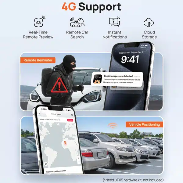 תמיכה במעקב חנייה Parking Surveillance 24 שעות ביממה באמצעות אביזר כבל מתאם UP03 (נמכר בנפרד).
