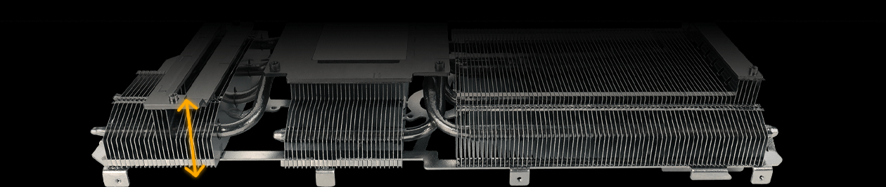 2.7 Slot DesignThe heat spreader draws heat up into heatpipes that carry it through a fin stack that fills most of the card's large, 2.7-slot footprint.