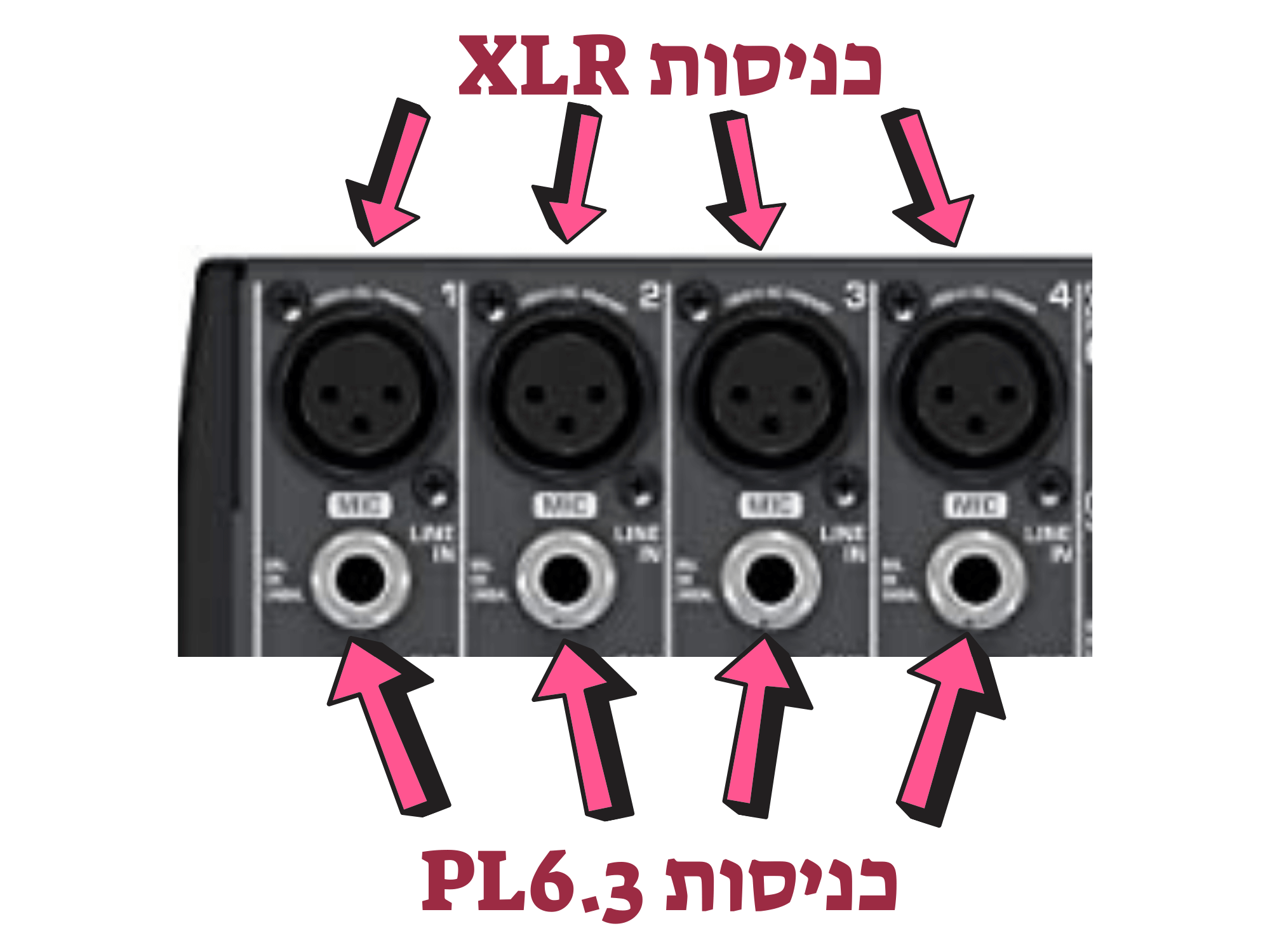כניסות המיקסר, כאמור למעלה, לרוב יהיו בתצורות של XLR או PL 6.3 בדומה לתמונה הבאה: