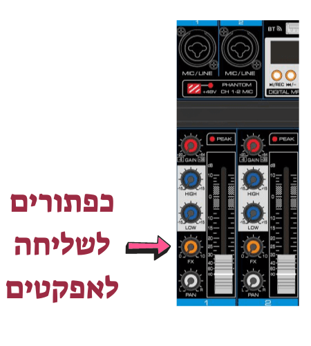 כדי לשמוע את השפעתם על אות הקול שלנו, יש לשלוח את האות מהערוצים אל יחידת האפקטים באמצעות הכפתורים הסיבוביים לידם כתוב FX.