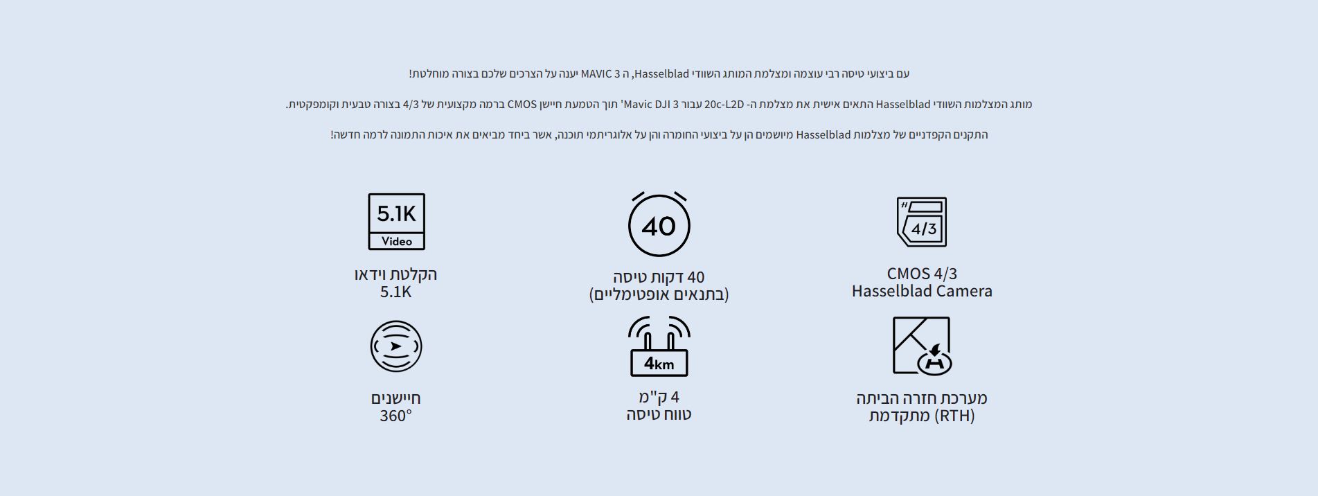 עם ביצועי טיסה רבי עוצמה ומצלמת המותג השוודי Hasselblad, ה MAVIC 3 יענה על הצרכים שלכם בצורה מוחלטת!