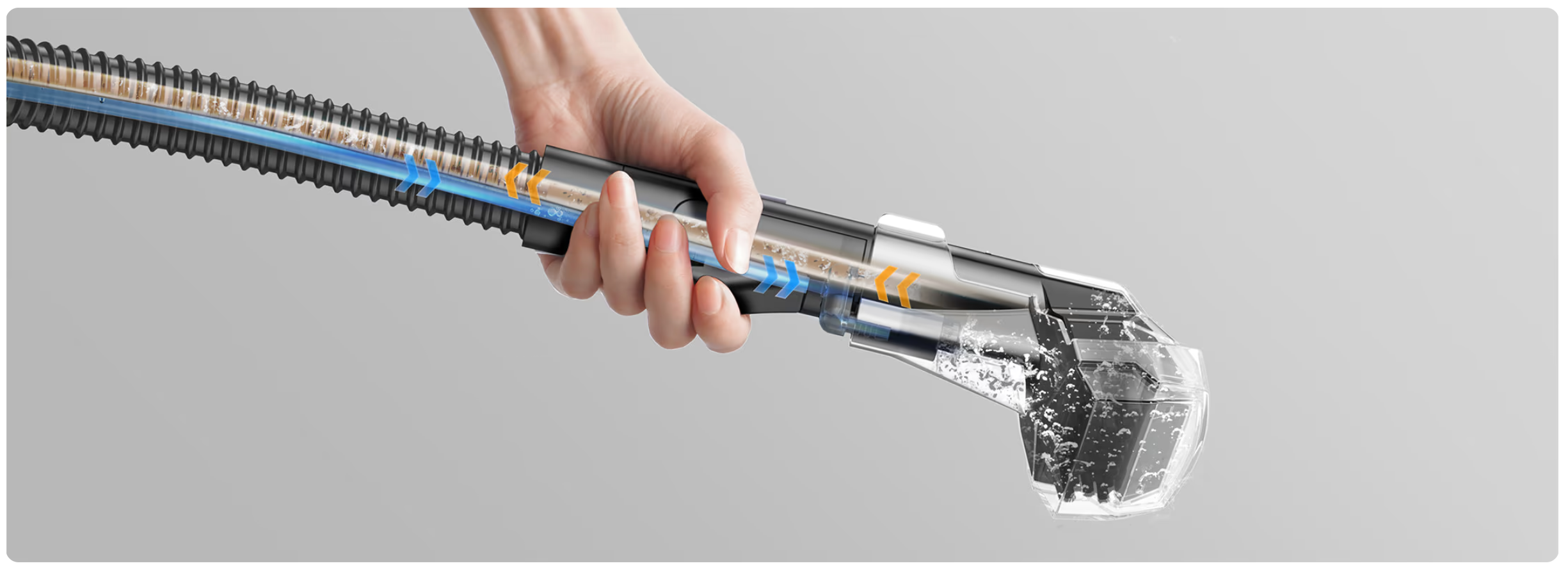 השואב-שוטף הידני משתמש בעוצמת השאיבה החזקה 12,000PA כדי לשטוף ביסודיות את פנים הצינור, ולמזער את ההצטברות של לכלוך וריח