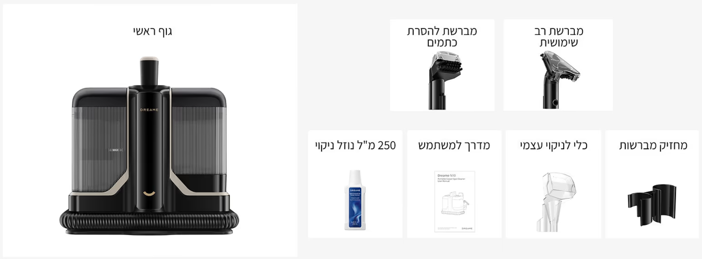 לניקוי רב-תכליתי מגיע עם מברשת להסרת כתמים, מברשת רב שימושית וצינור וכבל חשמל ארוך במיוחד.