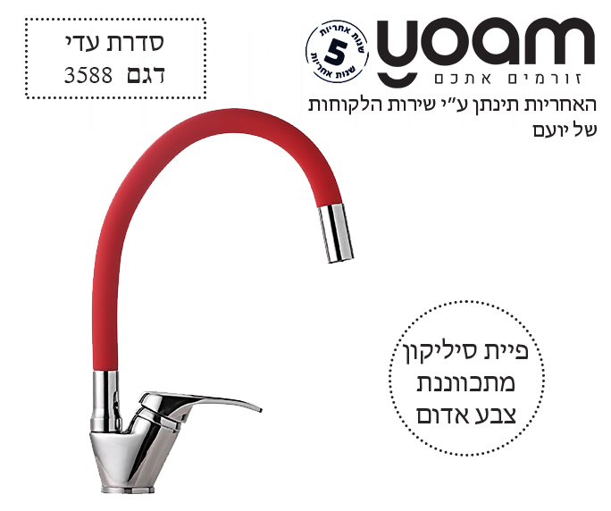 ברז לכיור מטבח | ברבור פיה סיליקון אדומה גמישה | גוף כרום ניקל | 3588 | סדרת עדי | יועם YOAM