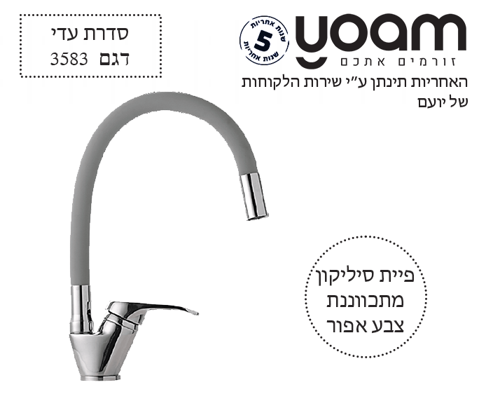 ברז לכיור מטבח | ברבור פיה סיליקון אפורה גמישה | גוף כרום ניקל | 3583 | סדרת עדי | יועם YOAM