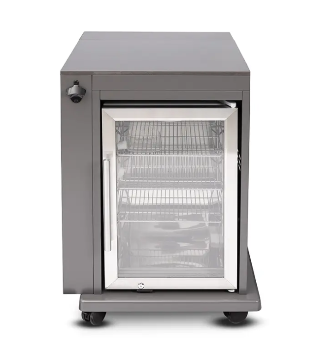 יחידת קירור איכותית למטבח החוץ שלך – הכוללת מקרר שקוף עם דלת זכוכית, תאורה פנימית ומדפים מתכווננים, נועדה לשמירה על משקאות ואוכל קריר ונגיש בזמן האירוח.