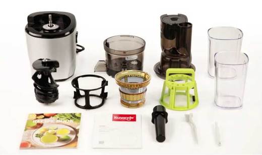 מסחטת מיץ, כוס מיץ, כוס שאריות, מסננת מיץ, מגב מסתובב, בורג סחיטה, דוחפן ירקות ופירות, מברשת ניקוי מסתובבת, מברשת ניקוי וחוברת מתכונים בעברית (ישנם חלקים נוספים שניתן לרכוש בנפרד)
