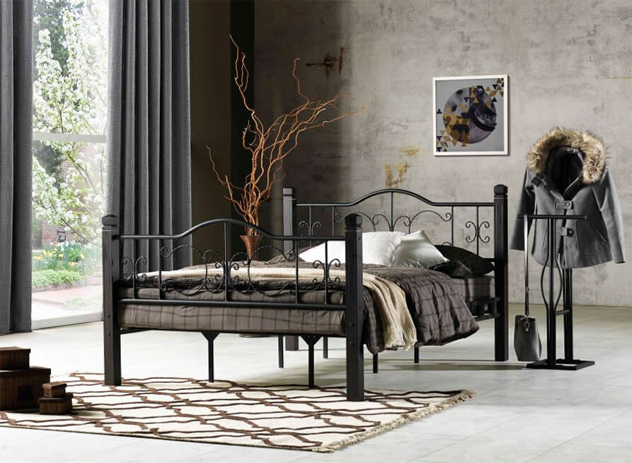 מיטת מתכת זוגית מעוצבת המוסיפה לחדר מראה צעיר ורענן.