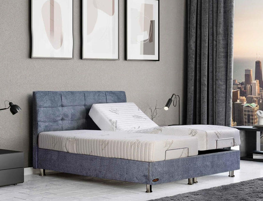 מיטה זוגית מתכווננת דגם מיקה מבית מדיקומפורט הכוללת מיטה זוגית מרופדת עם ארגז מצעים + ראש מיטה מרופד + 2 מנגנונים חשמליים מתכווננים מופעלים באמצעות שלט חוטי + 2 מזרני קפיצים מבודדים מבית מדיקומפורט המותאמים למבנה הגוף.