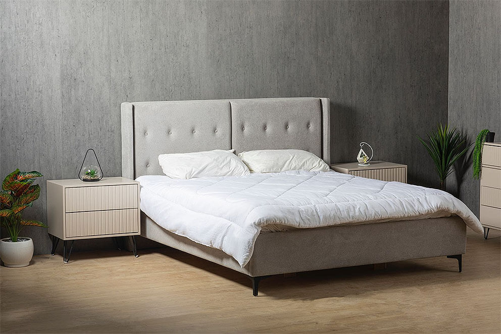 מיטה זוגית מרופדת בעיצוב עדכני וחדשני, בעלת ראש מיטה מרופד. עבודת רפדות מקצועית ורמת גימור מושלמת.