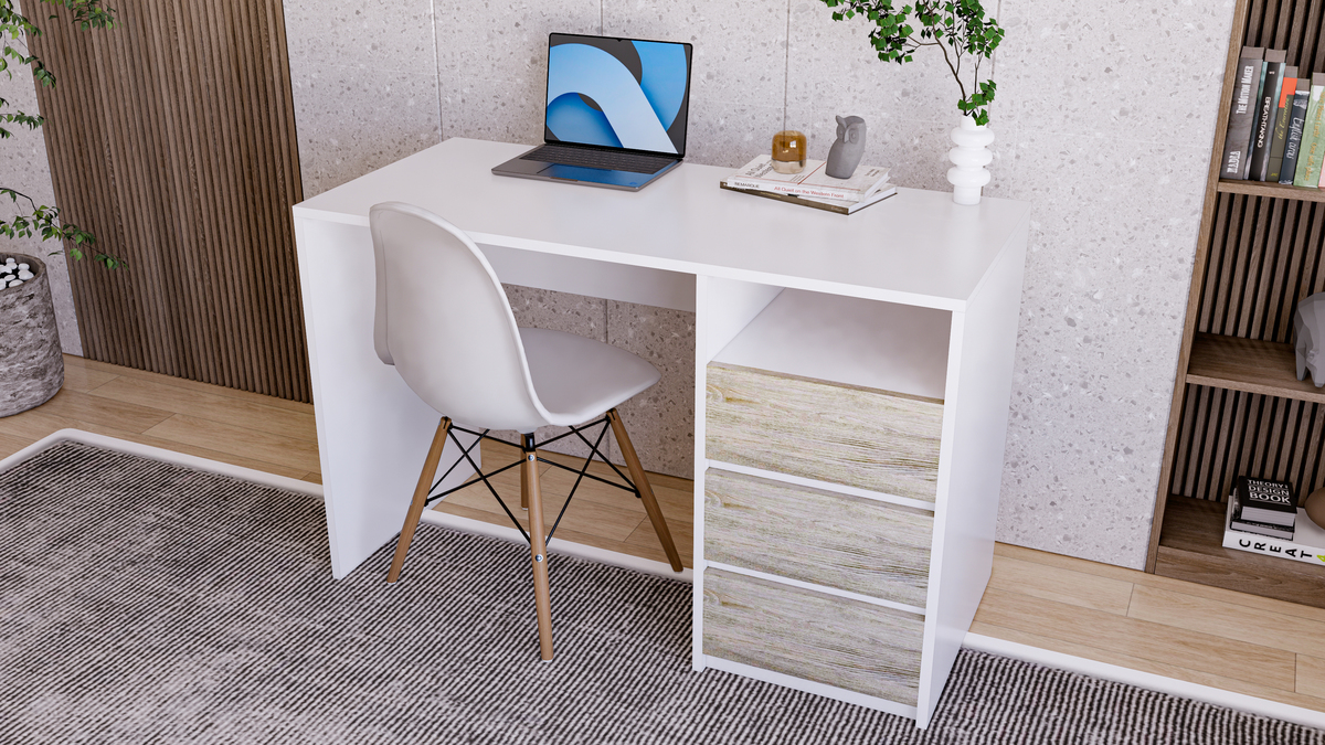 שולחן מחשב איכותי דגם ינאישולחן מחשב בעיצוב קלאסי בצבע לבן עם 3 מגירות צד בצבע אורן בהיר