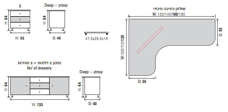 שולחן כתיבה פינתי: גובה: 75, רוחב: 120*160, עומק: 55.