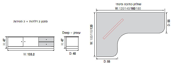 שולחן כתיבה פינתי: גובה: 75, רוחב: 160*120, עומק: 55.