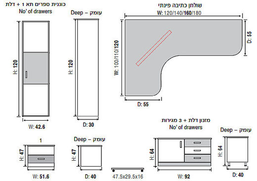 שולחן כתיבה פינתי: גובה: 75, רוחב: 160*120, עומק: 55.