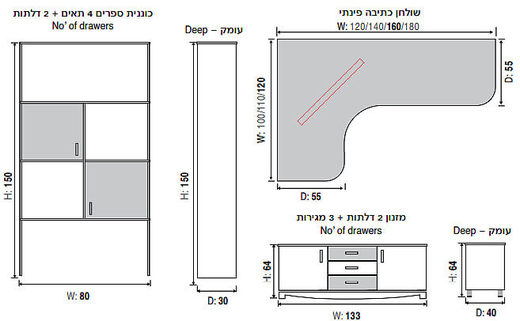 שולחן כתיבה פינתי: גובה: 75, רוחב: 160*120, עומק: 55.