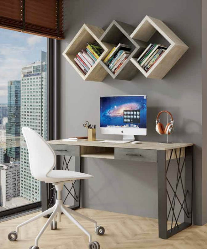 שולחן כתיבה במראה צעיר, עם רגלי מתכת מעוצבת בגוון שחור, עם 2 מגירות ותא פתוח לאיחסון.