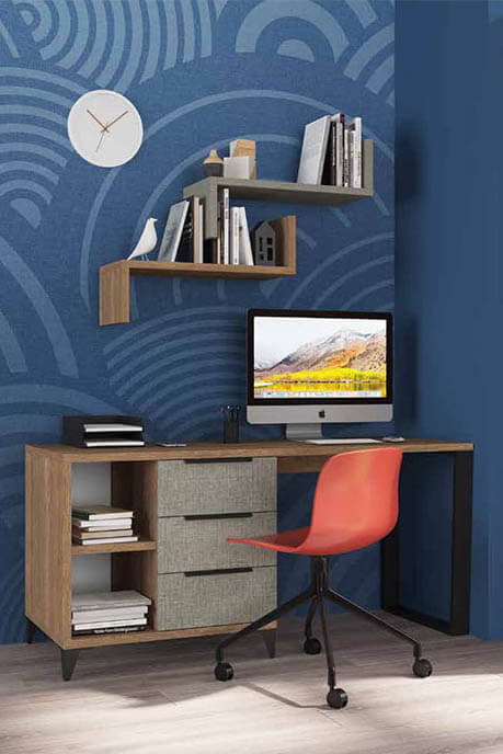 שולחן כתיבה במראה צעיר, עם רגל מתכת מעוצבת בגוון שחור, עם 3 מגירות ו-2 תאים פתוחים לאיחסון.