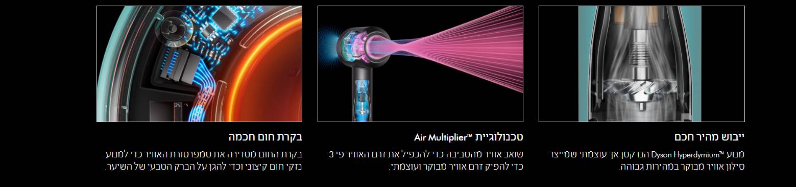 מייבש השיער Dyson Supersonic™ – עכשיו הוא חכם יותר. רשת של חיישנים ™Nural מתאימים אוטומטית את זרימת האוויר והטמפרטורה כדי להעצים את הברק הטבעי ולסייע לשמור על בריאות הקרקפת.
