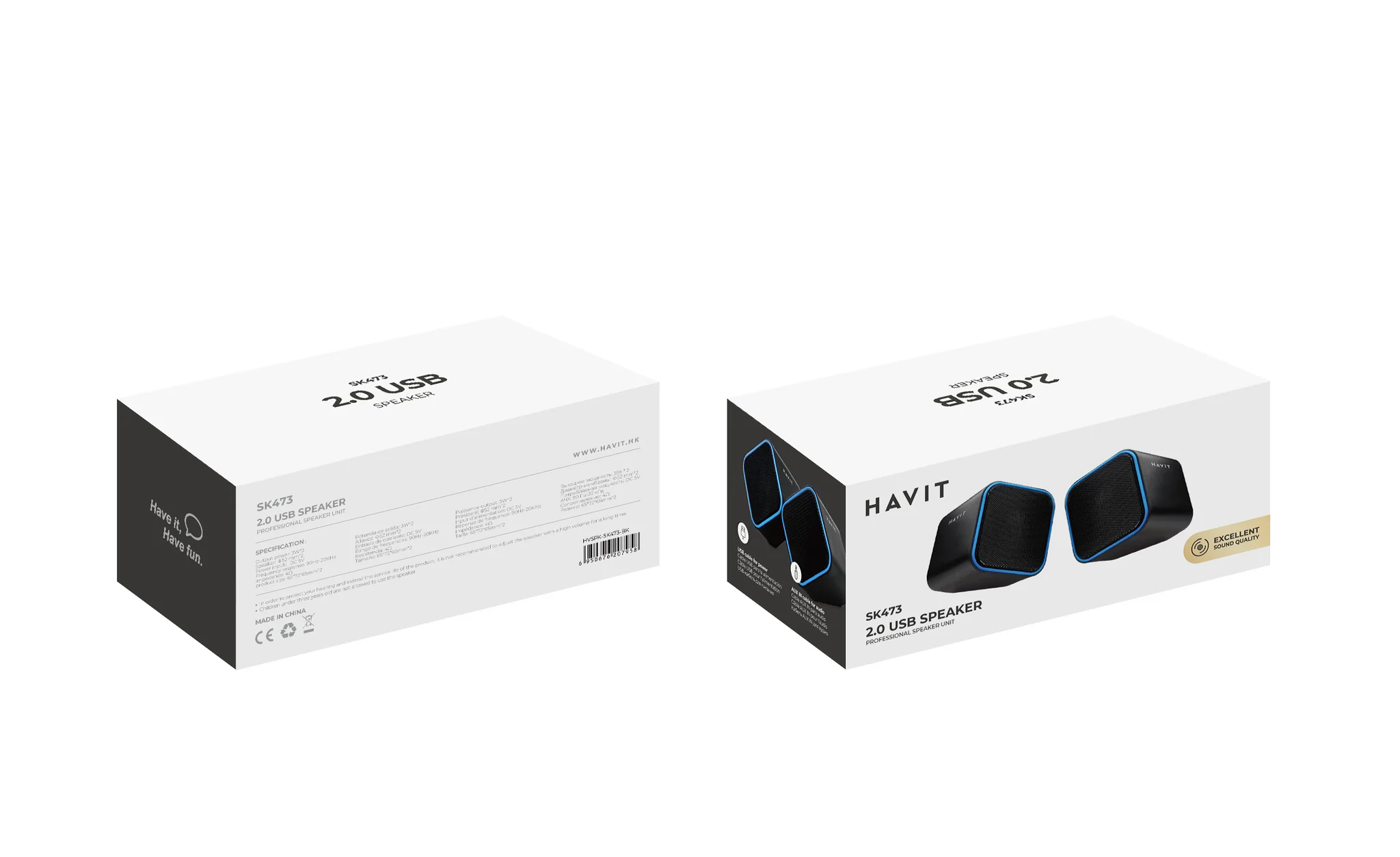 רמקולים USB 2.0 דגם Havit HV-SK473, עם הספק של 6W RMS. מספקים צליל נקי ואיכותי עם עיצוב קומפקטי, מושלמים לשימוש יומיומי במחשב.