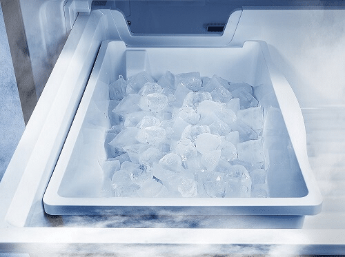 יצרן קרח אוטומטי במגירת המקפיא בעל חיבור ישיר לרשת המים, דואג לאספקת קרח רציפה ללא מגע ידי אדם.