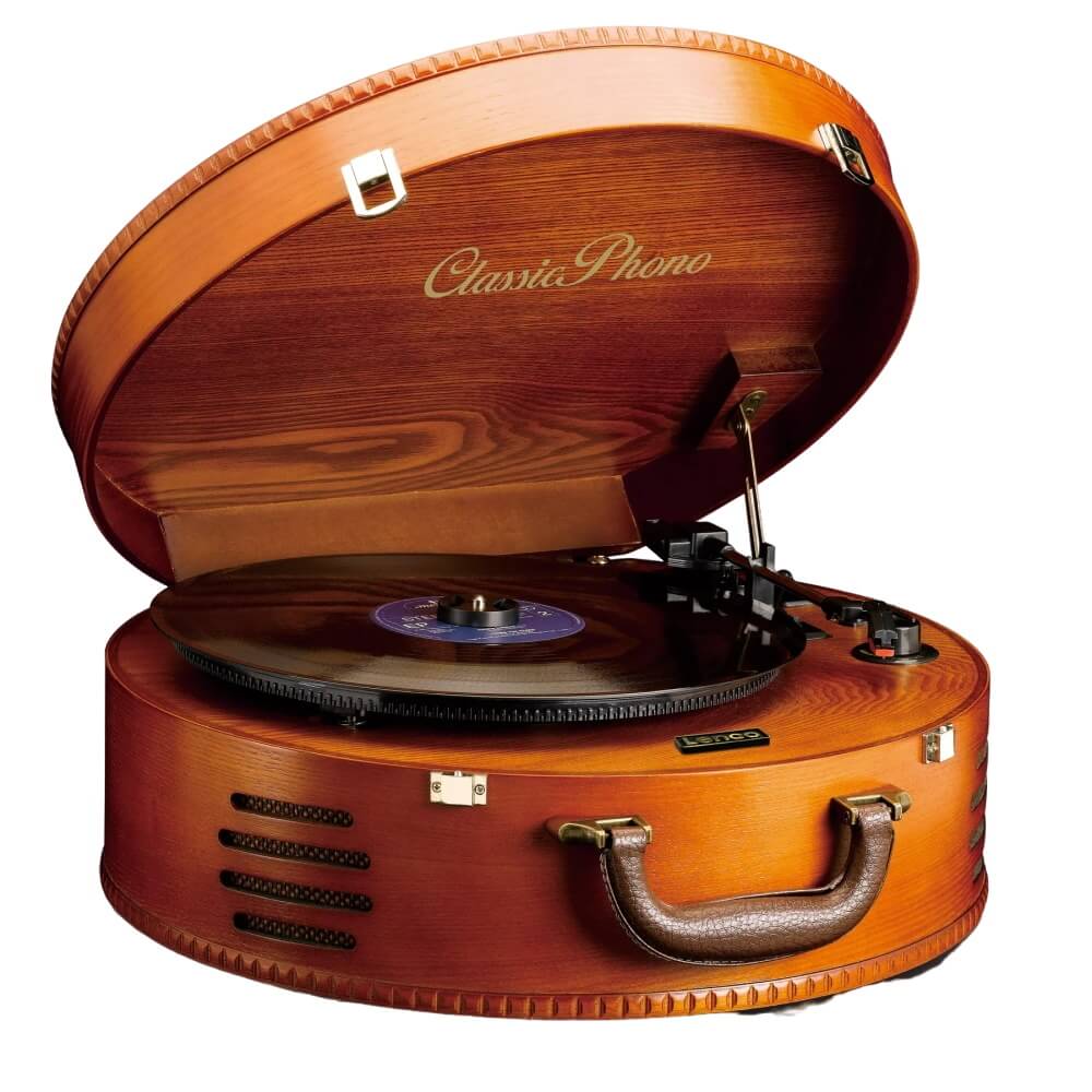 פטיפון מפואר ומסוגנן עם מראה רטרו אמיתי בעל מארז עץ עגול ויוקרתי