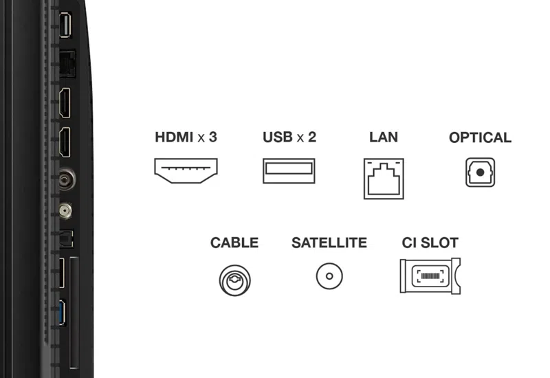 – יציאות נוספות: יציאת אודיו אופטית, כניסת AV 3.5 מ"מ, חריץ CI+, כניסת לוויין וכניסת אנטנה (RF)