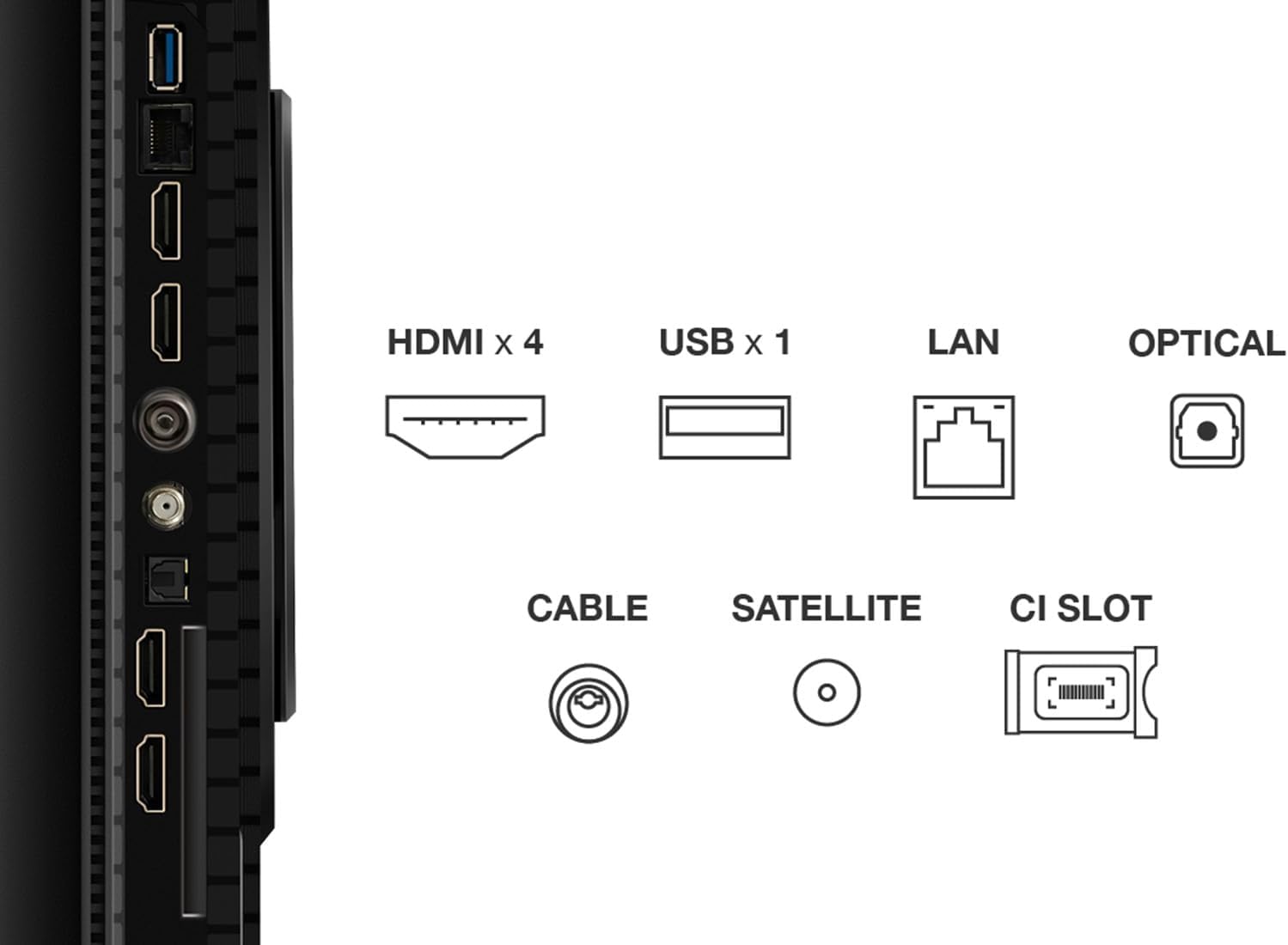 – יציאות נוספות: יציאת אודיו אופטית, כניסת AV, חריץ CI+, כניסת אנטנה ולוויין