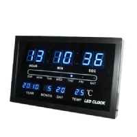 שעון קיר חשמלי יוקרתי בצבע כחול עם תאריכון ומד טמפרטורה.