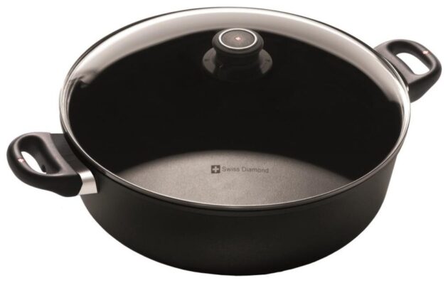 סיר נמוך 32 ס"מ 6.8 ל', בעל גוף אלומיניום יצוק, מחמם את התוכן במהירות ובאופן שווה ולכן דורש פחות ערבוב. הסיר מגיע עם מכסה זכוכית מחוסם לחום. ניתן להשתמש בתנור עד 260° מעלות.
