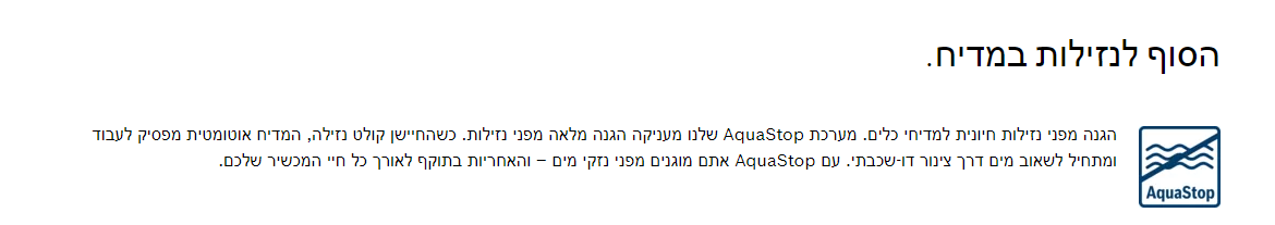 (* האחריות הנוספת המוגבלת על מנגנון AquaStop הינה בנוסף לתנאים המצוינים בתעודת האחריות