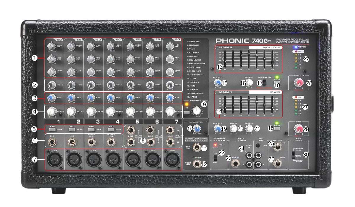 - מיקסר מוגבר 7 ערוצים Powerpod 740 Plus של Phonic