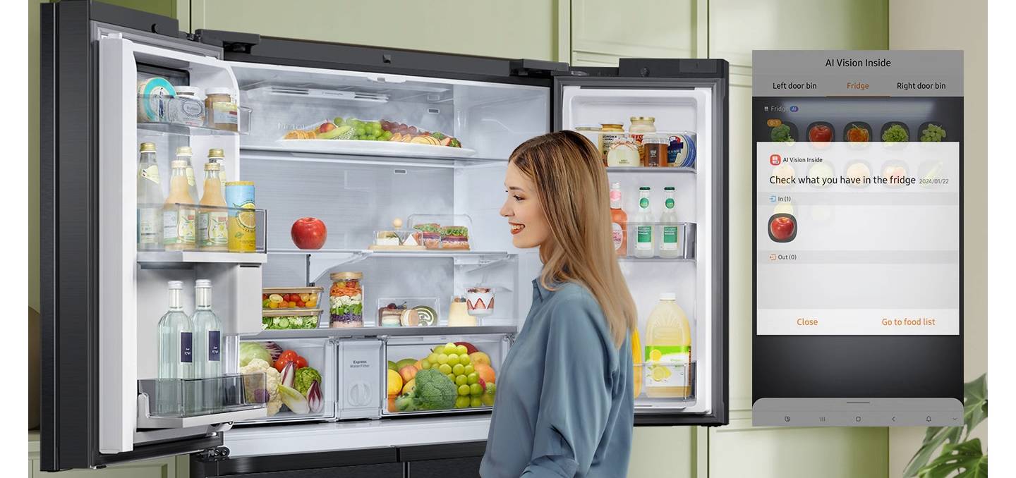 בואו ליהנות מדרך חכמה לנהל את האוכל שלכם. באמצעות מצלמה פנימית*, טכנולוגיית AI Vision Inside** יכולה לזהות פריטי מזון טריים מסוימים בעת הכנסתם או הוצאתם, ומאפשר לכם לנהל רשימת מזון***. תוכלו להציג תמונות של המכלים בדלת, לקבל הצעות למתכונים או לנהל “תאריכים אחרונים לשימוש” באמצעות הגדרת התאריך באופן ידני.